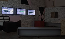 Physical: reclaimed and recycled gallery constructions (walls, seating, structures, etc.), HD projector, 3 LCD screens, computers, custom-built motion sensor and 5.1 surround sound system.