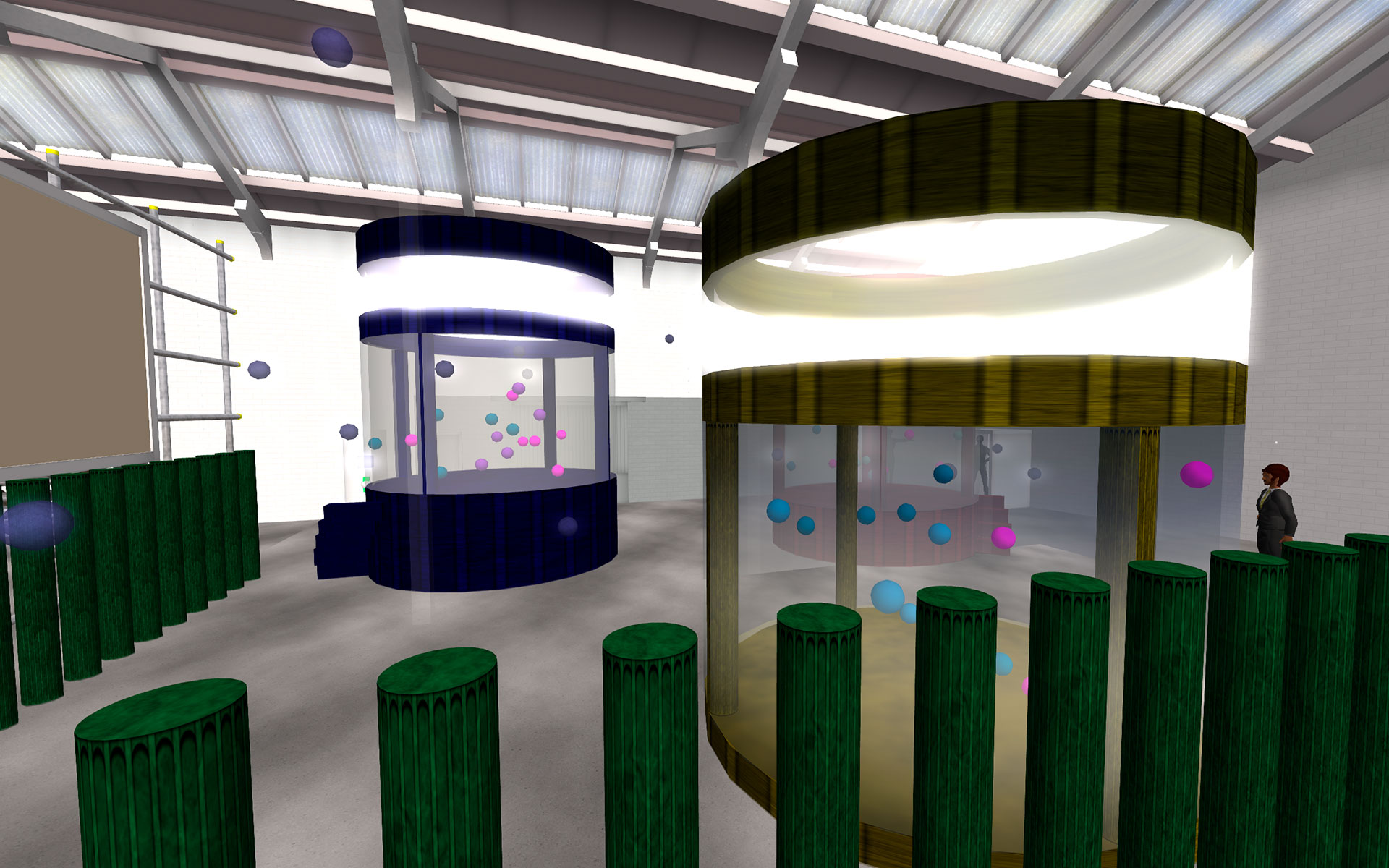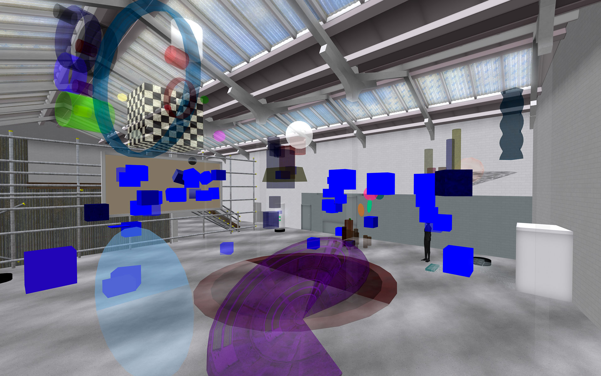 Situated in Eastside Projects’ second gallery, the artwork’s physical component is a constructed environment that has been fabricated using recycled materials collected from the gallery’s previous exhibitions. Live audio and video from the virtual gallery are streamed into the physical space through a group of Dolls (virtual bodies devoid of human agency that are used to ‘sense’ and transmit aspects of a virtual world). Visitors entering the gallery are tracked by a hidden motion sensor that relays its data to the virtual realm. The presence of spectators in the physical space causes translucent blue spheres, each having just a 12-hour lifespan, to be generated within the virtual world for resident artists to use.