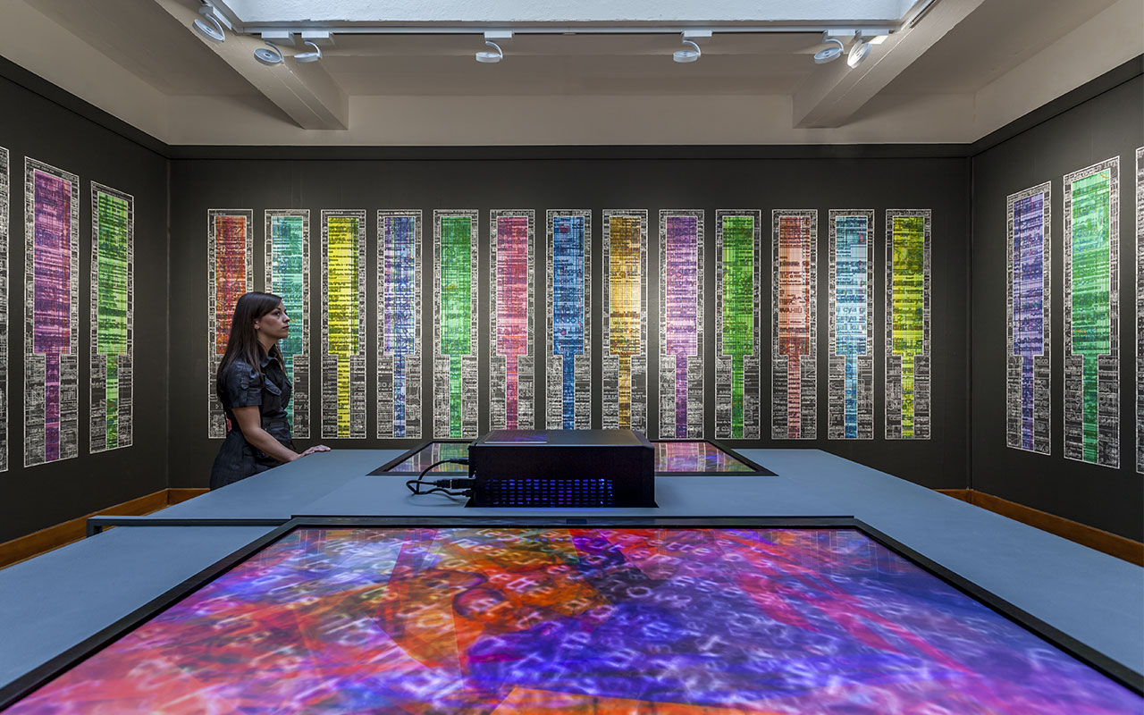 Data_cosm v1.0 was commissioned in 2005 for the Net:Reality exhibition with funding from Arts Council England and generous support from King's Visualisation Lab, Centre for Computing in the Humanities, King's College London. Version 1.2 was produced in 2014 for the Living Data solo touring exhibition.