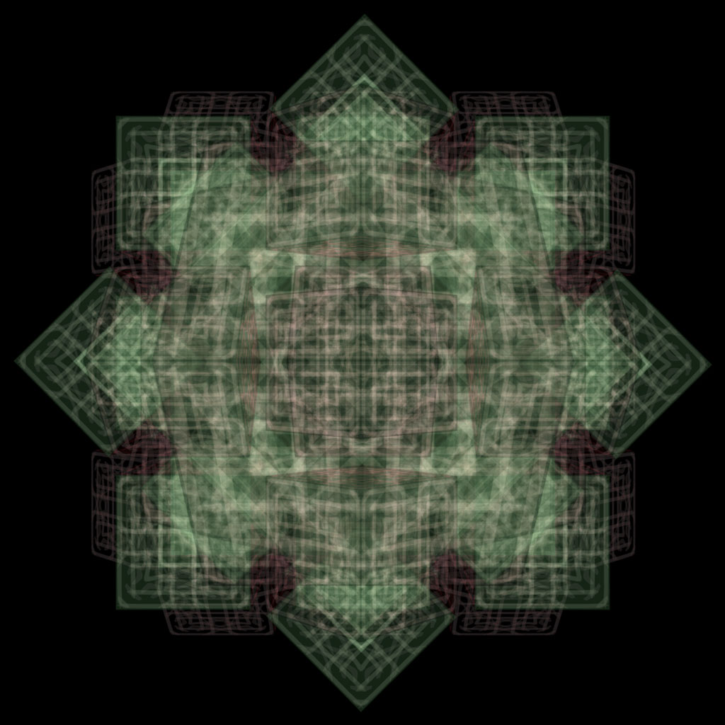 Each word in its text format is imported into a two-dimensional 32x32 pixel Flash file. The embedded characters are then vectorized, re-proportioned into a square configuration, and multiplied at 90° intervals and their respective mirrored states. The result is a group of mandala-esque entities less than 1KB in size that can be infinitely expanded without pixilation. These visual elements are then rasterized as 64x64 pixel bitmaps which are subsequently translated into sonic analogues. The visual and audio equivalents are inherently paired and provide the basis for the next evolutionary stage of the artwork.