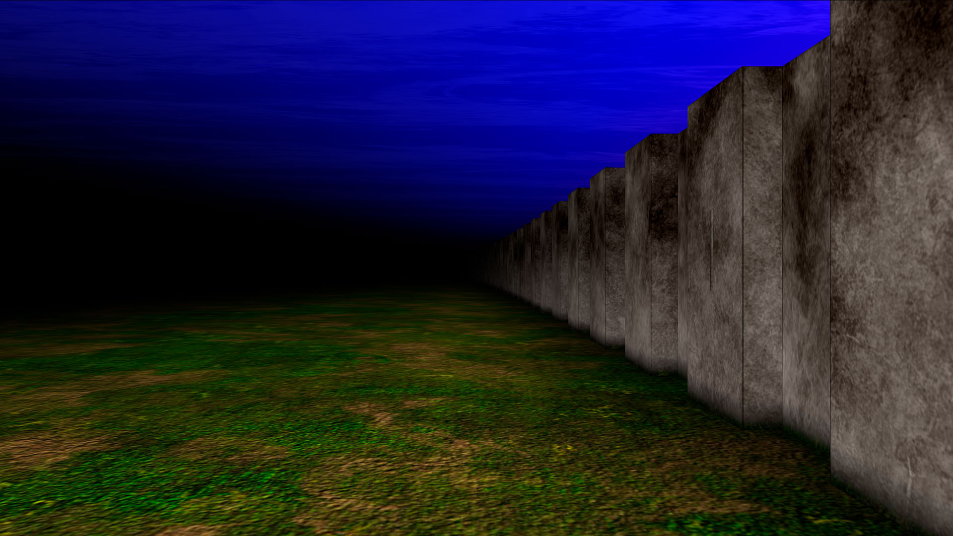 (endless) Wall is a virtual 3D environment into which a single individual can venture. Upon entrance, the user is confronted by a wall that spans into the distance, whilst behind them a barren ground dissipates into a black void. The wall is impassable. As the individual journeys along its base there is never a break in the structure or a means to transverse the barrier.